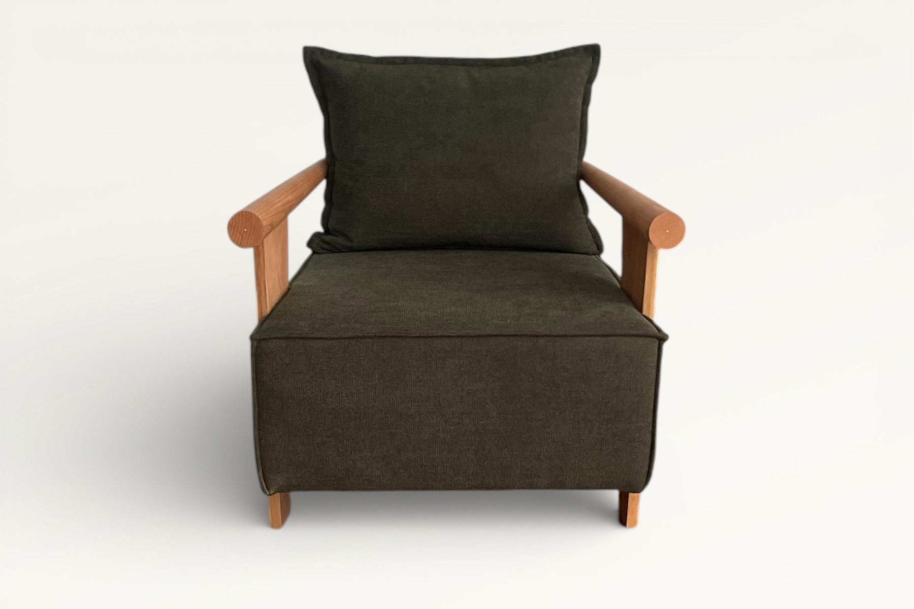 OSSA celebrates simple geometric pattern with a deep base cushion supported by natural oak finish frame.